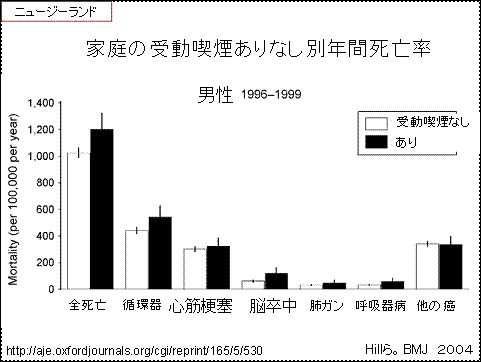 11. 日常生活の受動喫煙で受動喫煙者の10~20%が死ぬというのは本当ですか? 本当です。 タバコを吸わないけれど家庭の受動喫煙がある人とない人でどれくらい死亡率が違うかという追跡調査をしてわかったことです。ニュージーランドでは、男性非喫煙者の年間死亡率は受動喫煙なしで10万人あたり1000人でしたが、受動喫煙ありでは10万人あたり1200人と20%も増加していました。この1200人のうち受動喫煙による超過死亡が200人ということは、200÷1200≒17%が家庭における受動喫煙で「殺された」ということになります。非喫煙女性ではその比率はさらに大きく、23%が受動喫煙死していました。