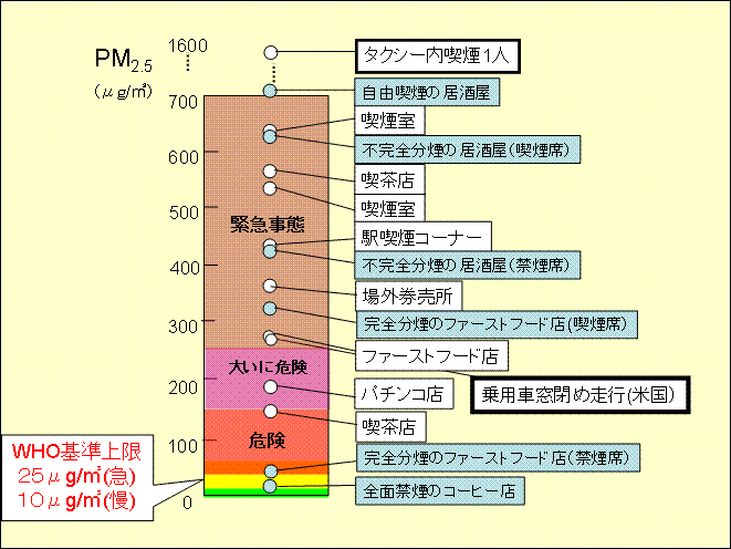 14. 「完全分煙」で受動喫煙の害は防げますか? 防げません。 その理由は、第一に、絶対に煙の漏れない「完全分煙」は不可能だからです。タバコの煙の臭いを感知できるタバコ煙閾値濃度(最低濃度)はタバコ煙由来微小粒子濃度(PM2.5)として、1μg/㎥です。(Junker等. Environ Health Perspect 109:1045-52,2001)「完全分煙」の喫煙区域の出入りに伴って禁煙区域で少しでもタバコの臭いがした時、そこは、10万人あたりの生涯死亡リスクが100~600人になっています。(世界保健機関の空気の質ガイドライン2005年版(“WHO air quality guidelines 2005”で検索のこと)に示されているように、PM2.5が10μg/㎥増えるごとに全死亡が6%(急性曝露)~10%(慢性曝露)増加することから計算した結果です。) アスベスト規制と同じレベルの日常生活の安全を実現するためには、ごくわずかに臭うタバコ煙入り空気の濃度をさらに数百分の1に下げなければなりません。「禁煙区域」の換気速度を数百倍に増やすことなど不可能です。 第二に、喫煙区域で働く人々の健康を守れないからです。分煙なのですから、当然「喫煙区域」があるわけです。喫煙区域は、先に述べたように、アスベスト規制基準を3桁から4桁上回る致死的タバコ煙汚染状態となっており、そのような場所で働かなければならない人々やサービスを受けざるを得ない非喫煙者の健康を守ることができないからです。食べ物への食品添加物や残留農薬の規制にはゼロリスクを求めながら、禁煙でない飲食店で無農薬野菜の料理を食べるという矛盾はなくさなければなりません。アスベストはダメだが、受動喫煙は構わないというダブルスタンダードは通りません。「例外なき屋内完全禁煙」だけが、受動喫煙問題の唯一の現実的な解決策です。(問 下の店主敬白の矛盾はどこにあるでしょうか?)